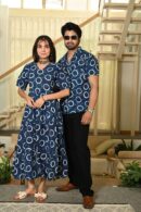 A modern navy blue cotton outfit highlighted with bold white circular prints. The women?s flowy V-neck dress and men?s casual half-sleeve shirt make the perfect coordinated couple look for casual outings, vacations, or festive gatherings.